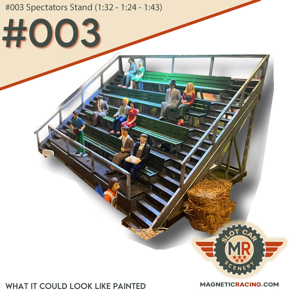 Before the words ‘Health’ and ‘Safety’ were ever used in the same sentence, a wooden spectators stand was a regular site at many motor circuits. The crowd would happily watch the mayhem and endlessly add half extinguished cigarette stubs to the pile of litter below! Our kit is perhaps a more robust construction and although looks intricate is in fact very straightforward to build. This is in part due to the interlocking nature of the design. As well as the tiered seating for 40 spectators, the support legs at the rear are also accurately modelled and visible through the slatted seats.