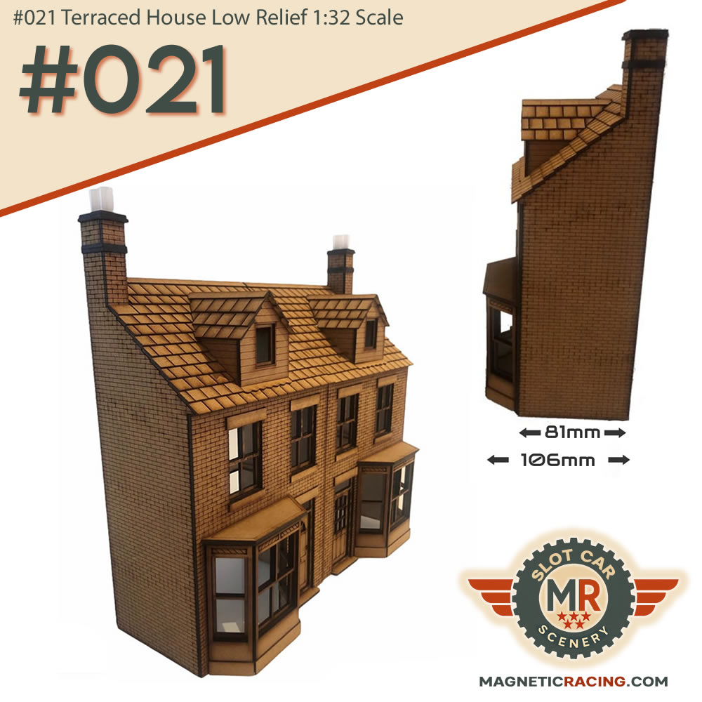 Our 1:32 scale (Gauge 1) #021 Terraced House Low Relief kit depicts the front sections of typical Victorian style ‘Two-up two-down’ dwellings. They are finely etched with brick detail and the roof slate and intricate chimney is accurately modelled. Space is often limited at the side of a track, so our low relief kit enables a row of houses to be added on a relatively narrow depth border. Only the front half of the houses are modelled in the kit which enables a row of dwellings to be added to your build. Two houses are provided in each kit, one left hand and one right hand.